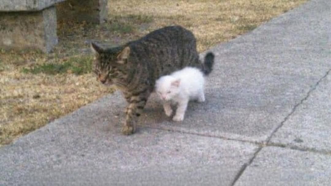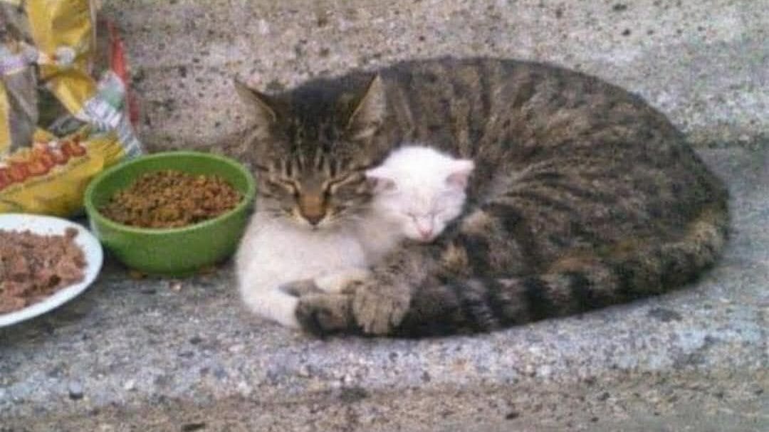 A seasoned stray who has survived years on his own now choosing to take responsibility for a kitten who would not stand a chance alone.