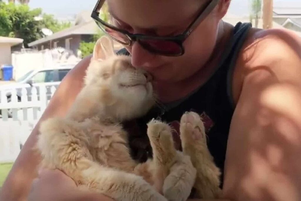 The scruffy, forgotten cat who could barely stand now can’t stop kissing the people who gave him a reason to keep going.