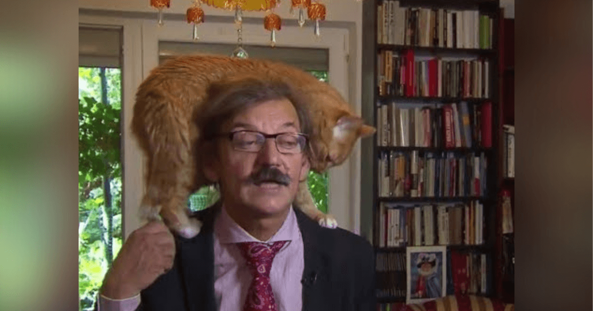 Targalski, a well-known political scientist, was speaking about serious global matters when his orange cat casually decided to join him on screen.
