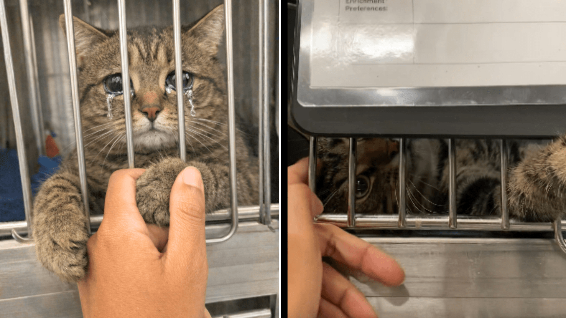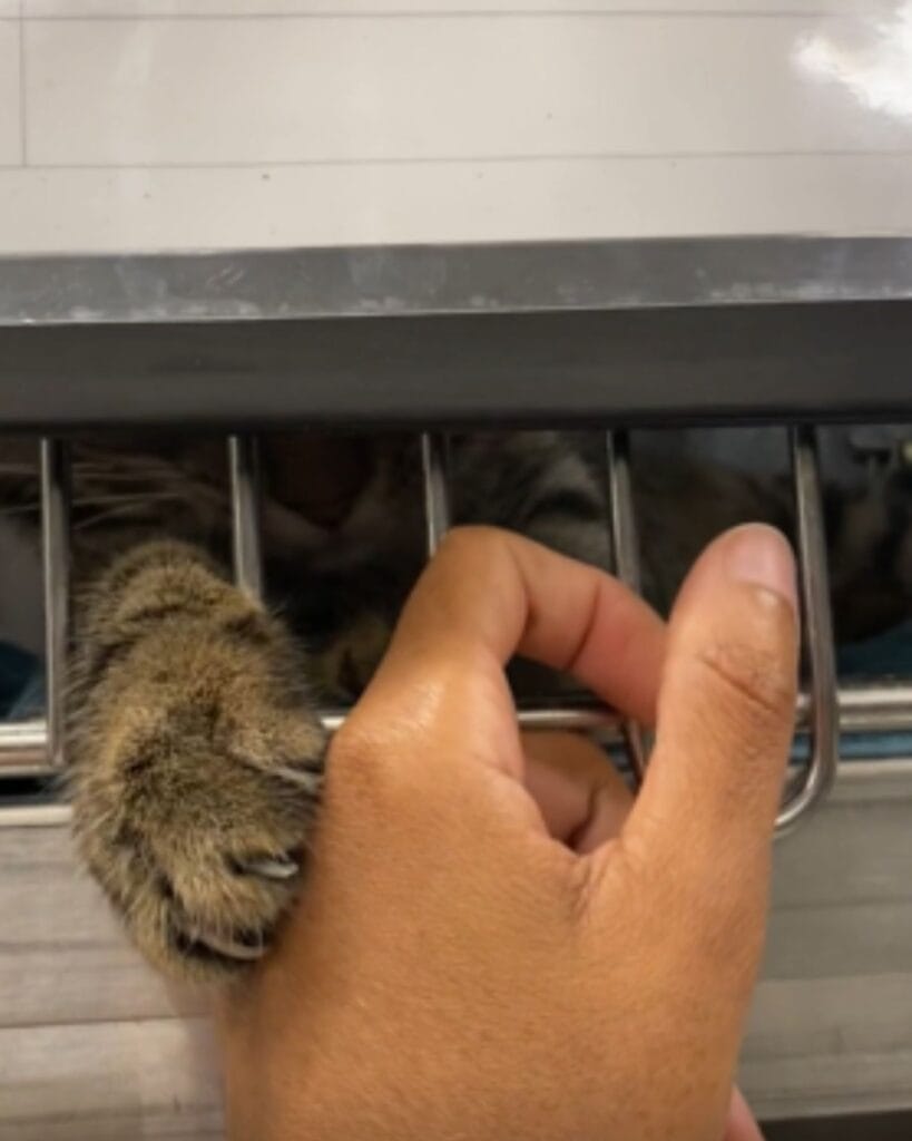 His tiny paw wraps around the visitor’s fingers. The movement is deliberate and careful, almost like he is trying to hold on.