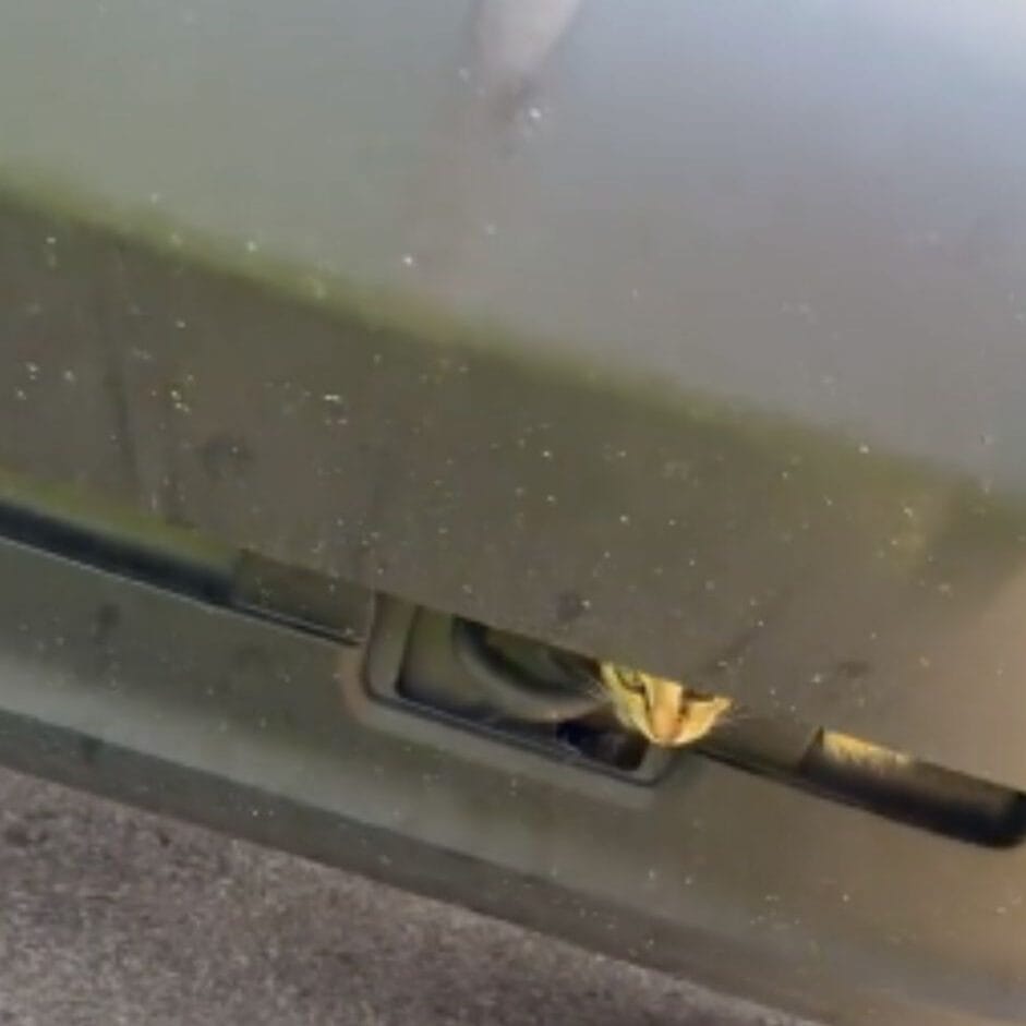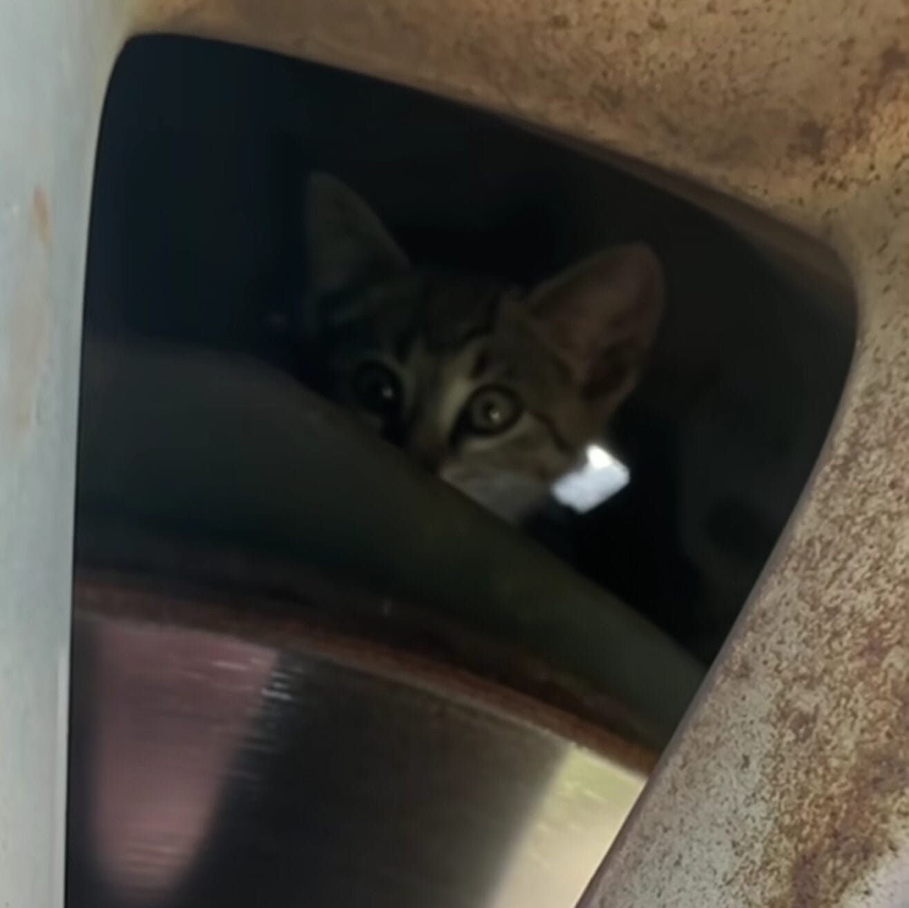 From beneath the bumper, a tiny kitten cautiously poked her head out.