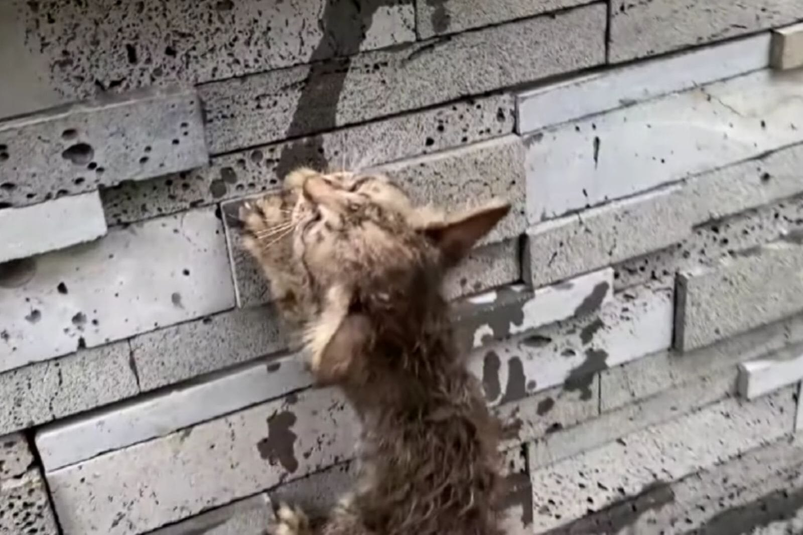 Soaked to the skin, shivering with cold, and covered in mud, the little one tried desperately to climb a wall in search of shelter.