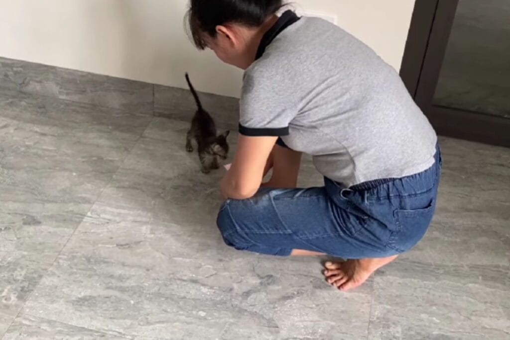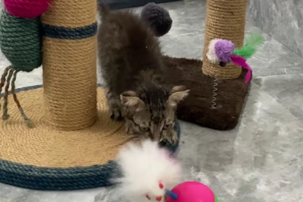 He pawed at toys, leapt onto cushions, and rubbed against her legs.