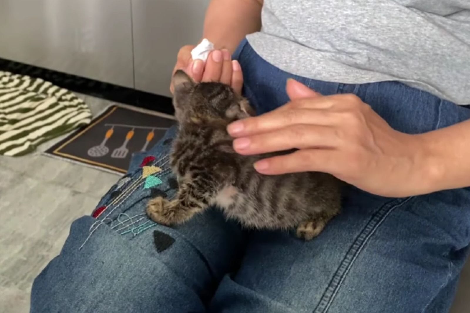 The kitten clung to her with what little strength he had left, finally safe in the warmth of human hands.