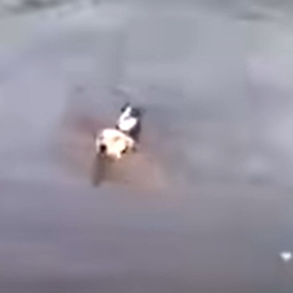 Then, suddenly, a dog appears at the edge of the lake. And before anyone can react, he dives right in.