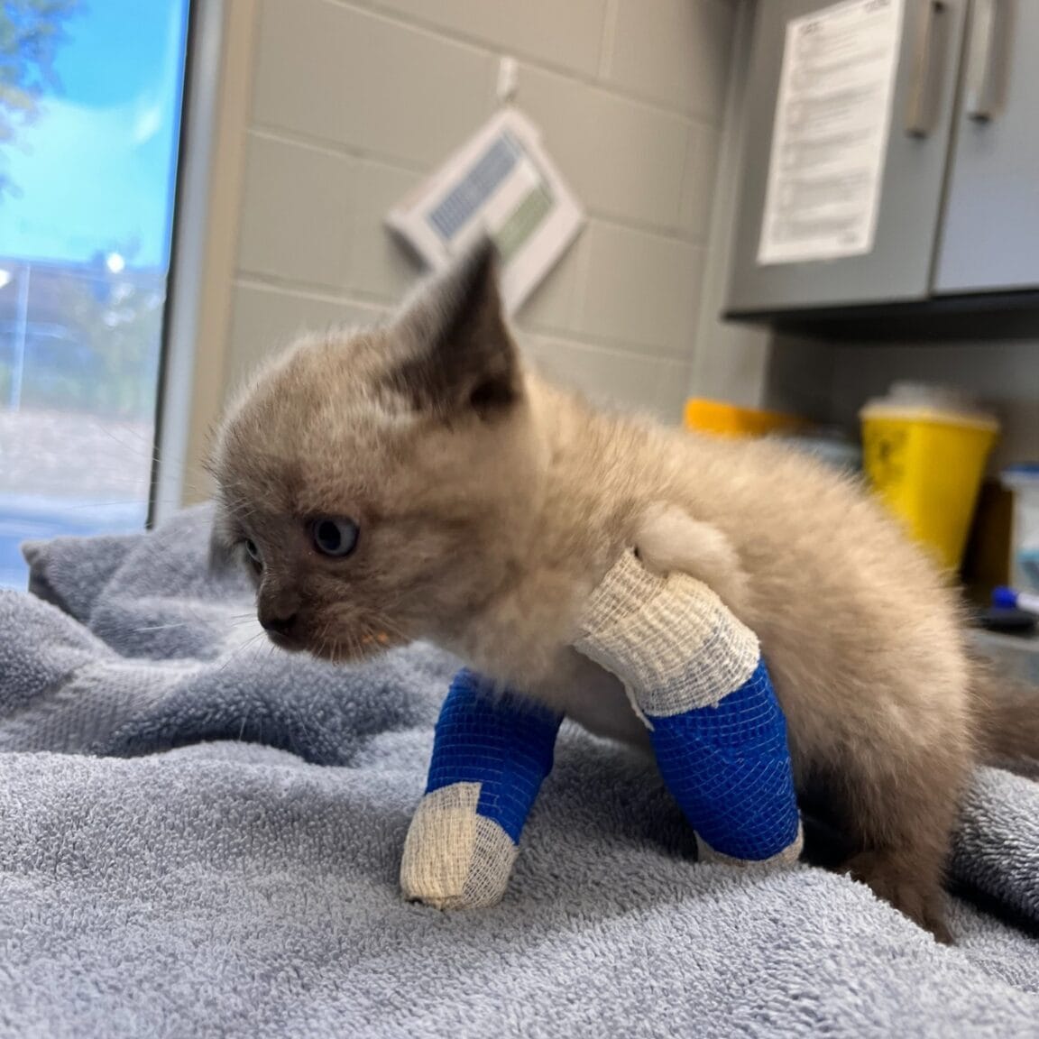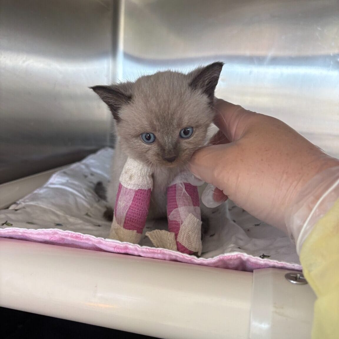 The sight of this tiny kitten wearing miniature splints was enough to melt even the coldest heart.