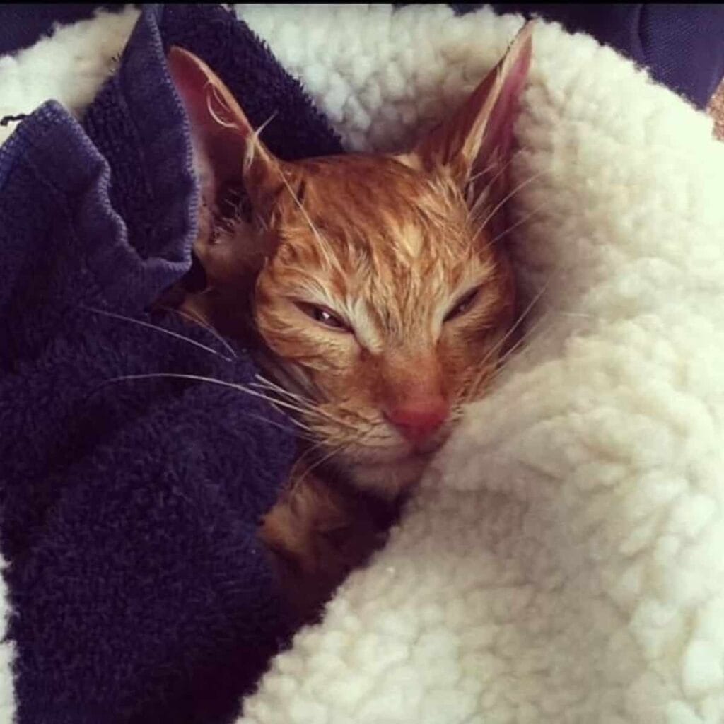 Once she was bathed, he wrapped her in a blanket and held her close, rubbing warmth back into her fur.