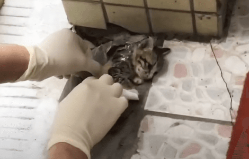 Slowly but surely, the sticky trap began to loosen, and after two more rounds of gentle cleaning, the kitten was finally free.