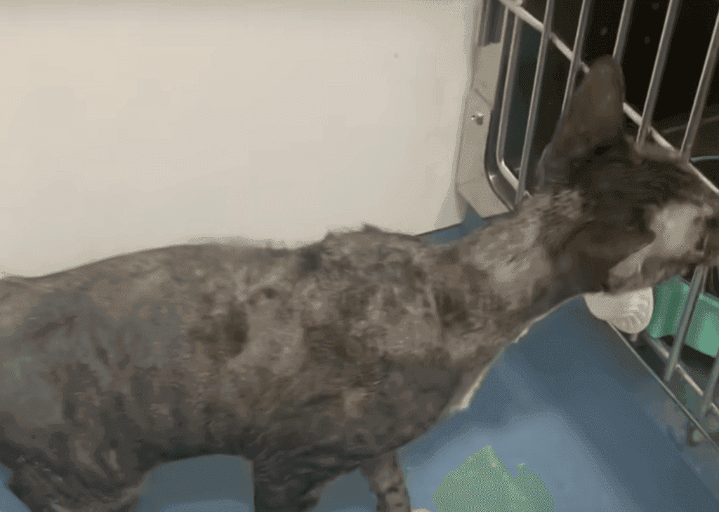 The hardened paint had not only trapped the cat’s fur, but it had also severely burned its skin.