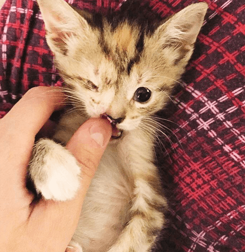 At first, Alex thought P might never manage on her own, but this determined kitten had no plans of giving up. With Alex’s round-the-clock care, she began to grow stronger.
