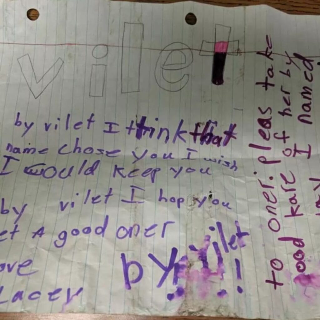 “Bye Violet. I think that name chose you. I wish I could keep you. Bye Violet, I hope you get a good owner. To owner: Please take good care of her. By the way, I named her. Thank you! Love, Lacey.”