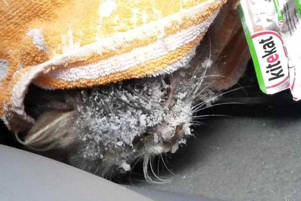 She was curled up tightly, her body stiff with frost, looking more like a frozen fur ball than a living creature.