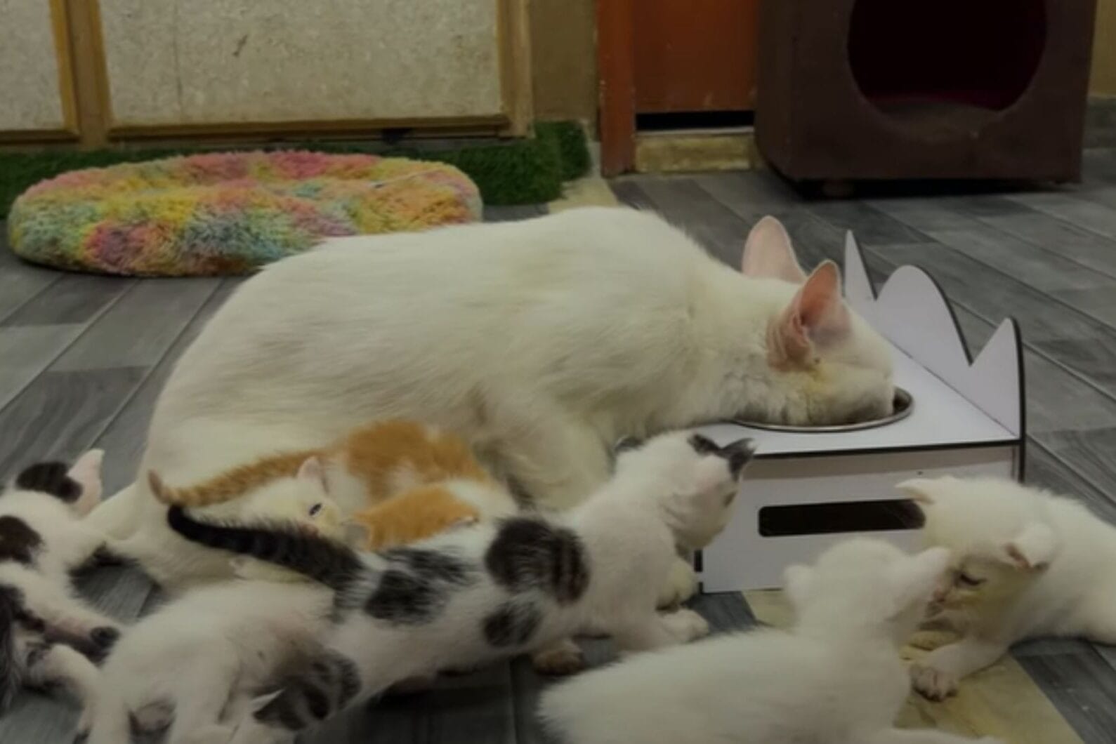 Soft blankets, food, and safety. For the first time, the mama cat and her kittens could rest without fear.