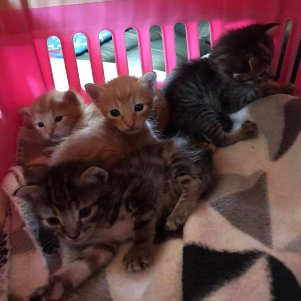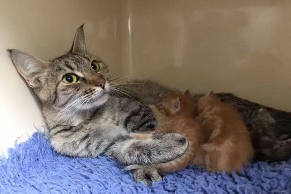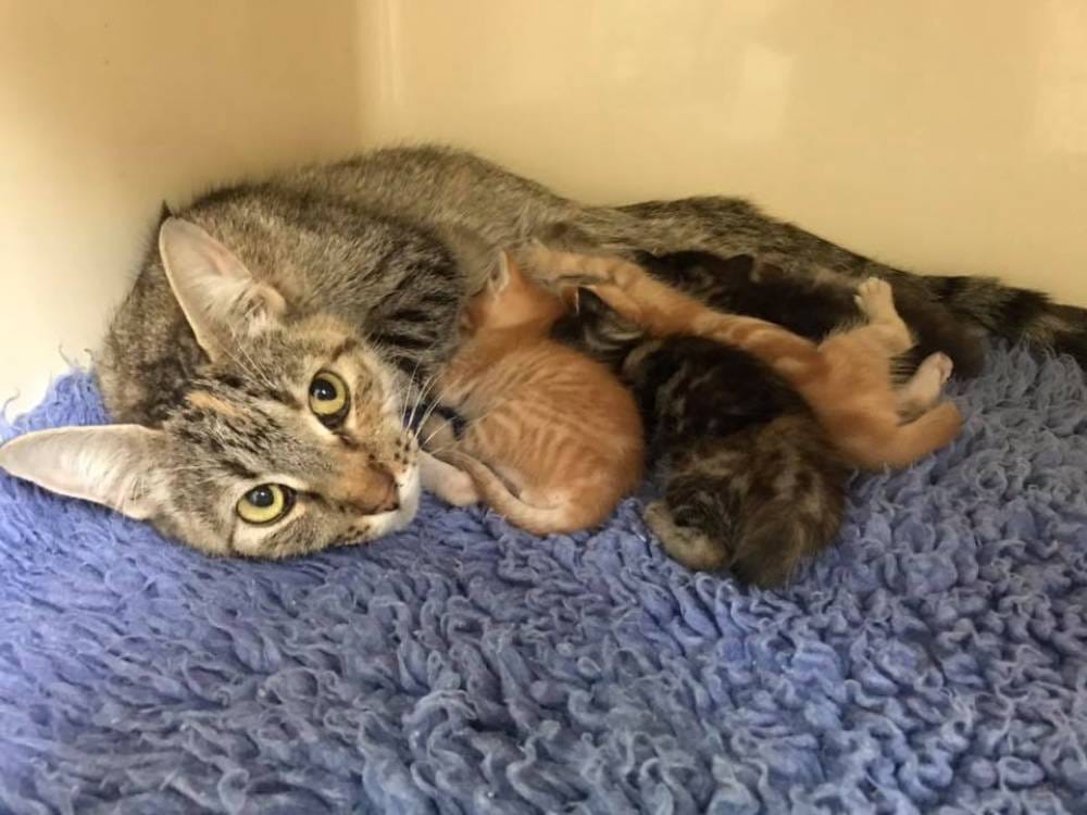 A mother cat and her tiny kittens had been found in someone’s yard.