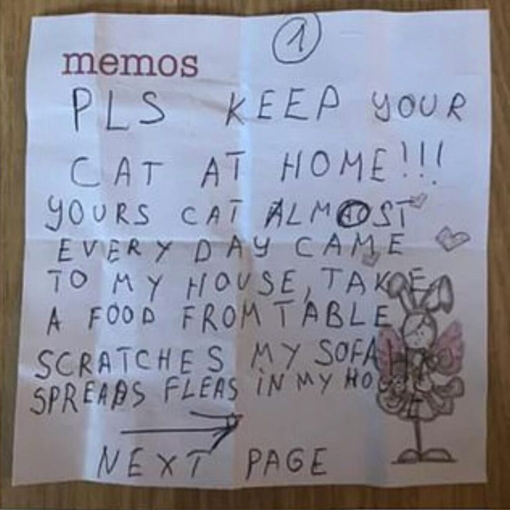 According to the letter, the cat had been entering a neighbor’s house almost daily.