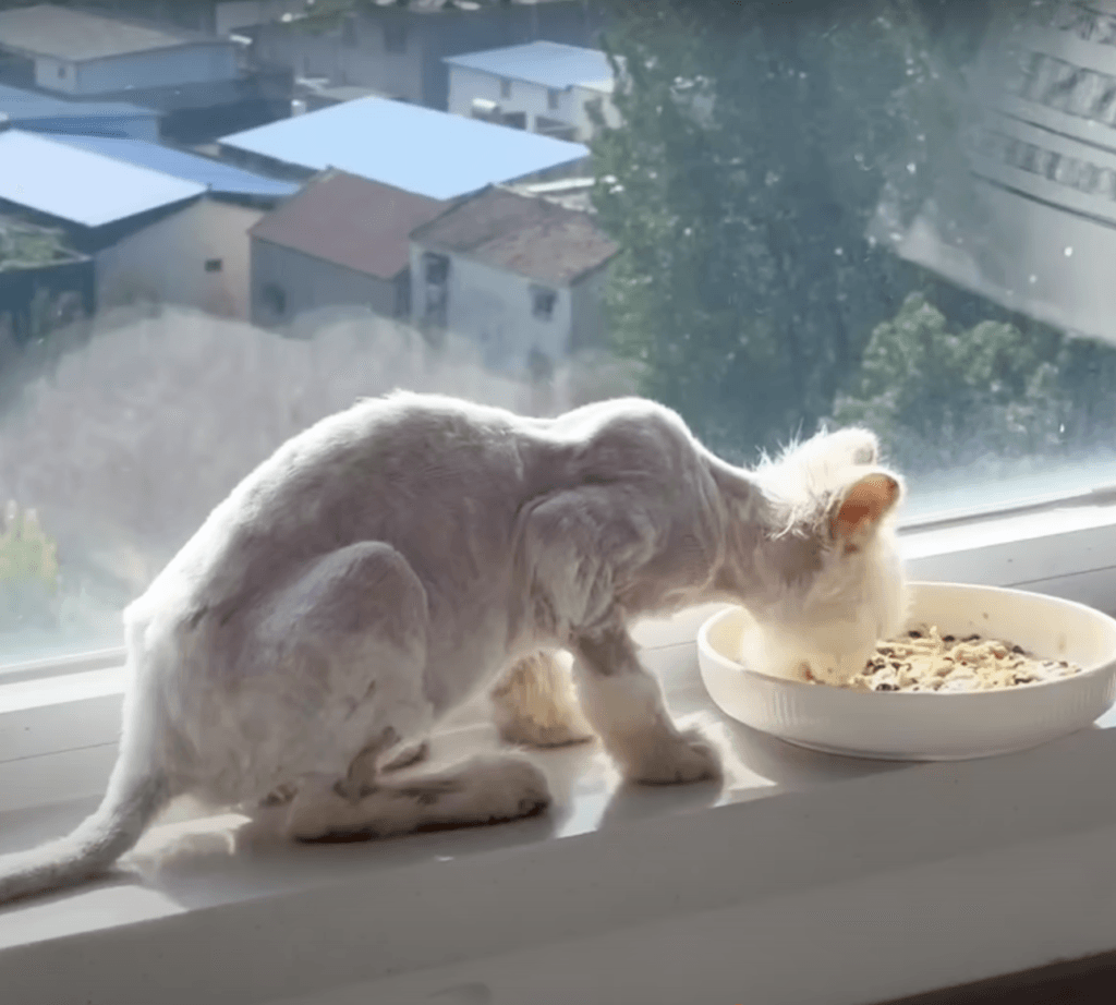 The first meal the kitten received was met with hesitation—she sniffed at it nervously, unsure if it was truly hers to eat.