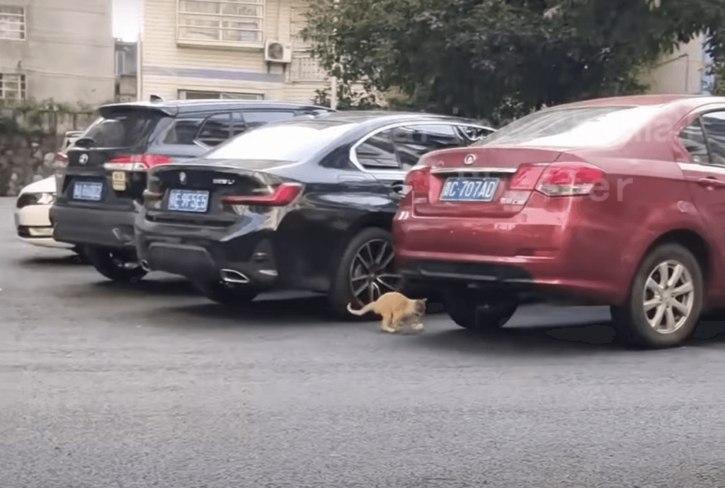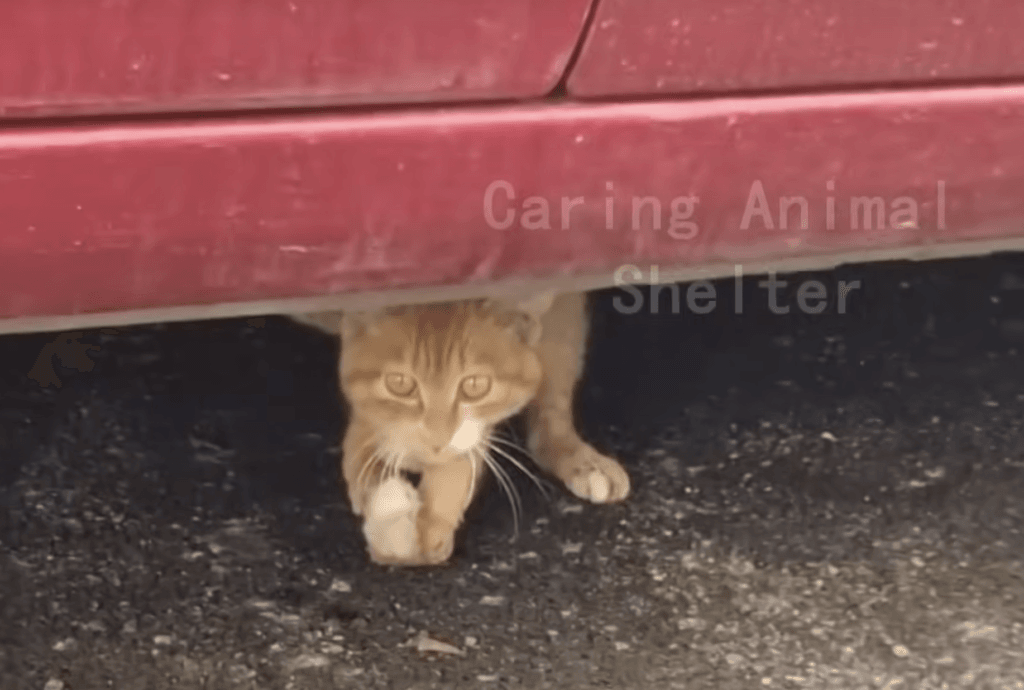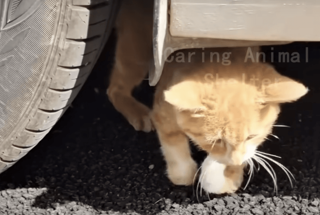 Despite its condition, the cat remained calm and even responded to her voice, gently poking its head out from under the car and stretching as if it were greeting a familiar friend.