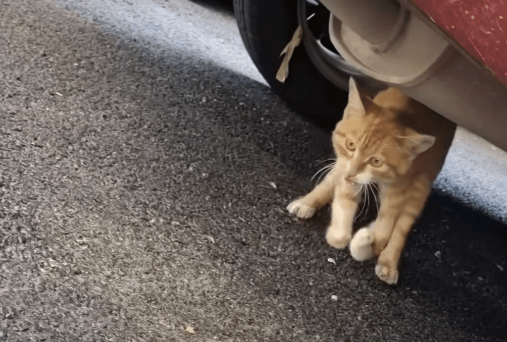 When a girl was walking down the street one day, she spotted a stray cat hiding underneath a parked car.
