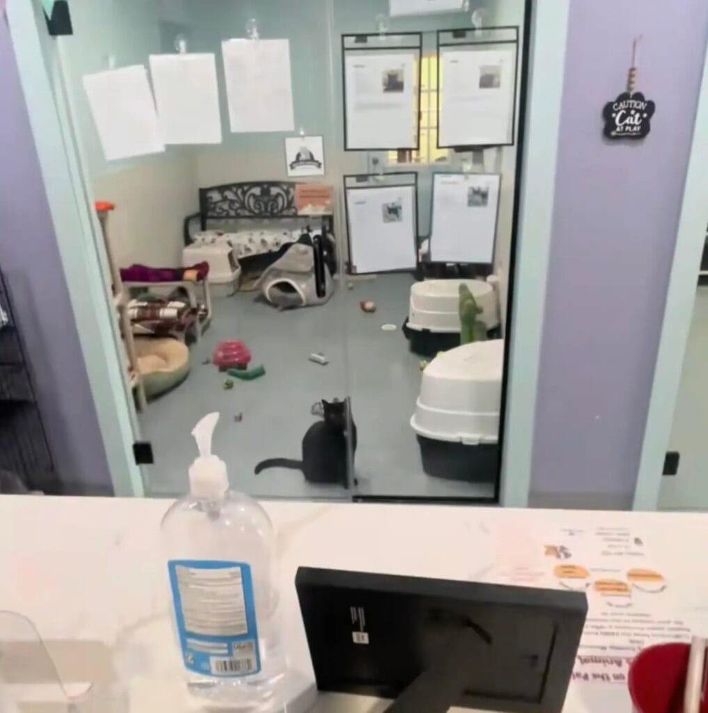 The fluffy black cat had made it his daily routine to sit near the glass entrance to the cat enclosure and stare out for hours.