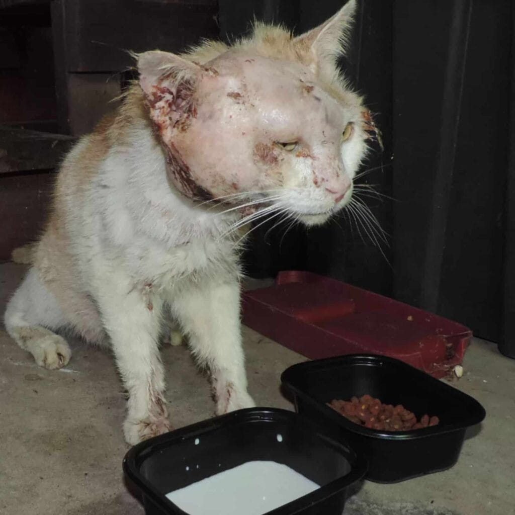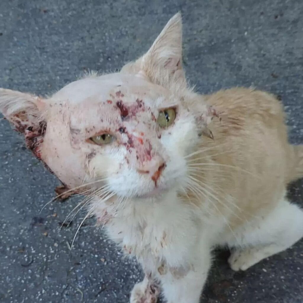 When he was first spotted, people could hardly even tell he was a cat. His body was so battered, so broken, it looked like he had been through a war.
