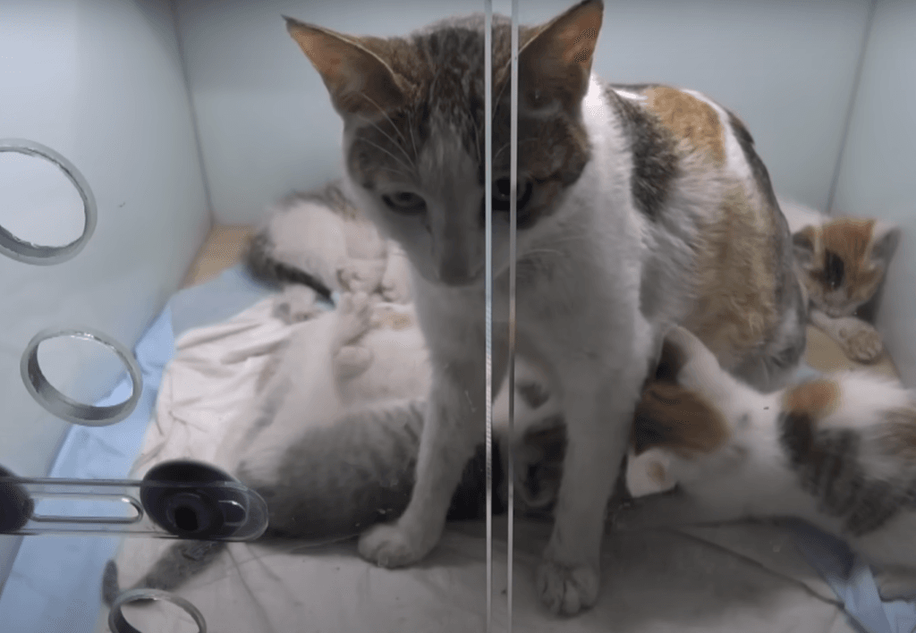 Her kittens, rescued by caring neighbors and fed at a temporary shelter, brought a glimmer of joy to her once weary eyes.