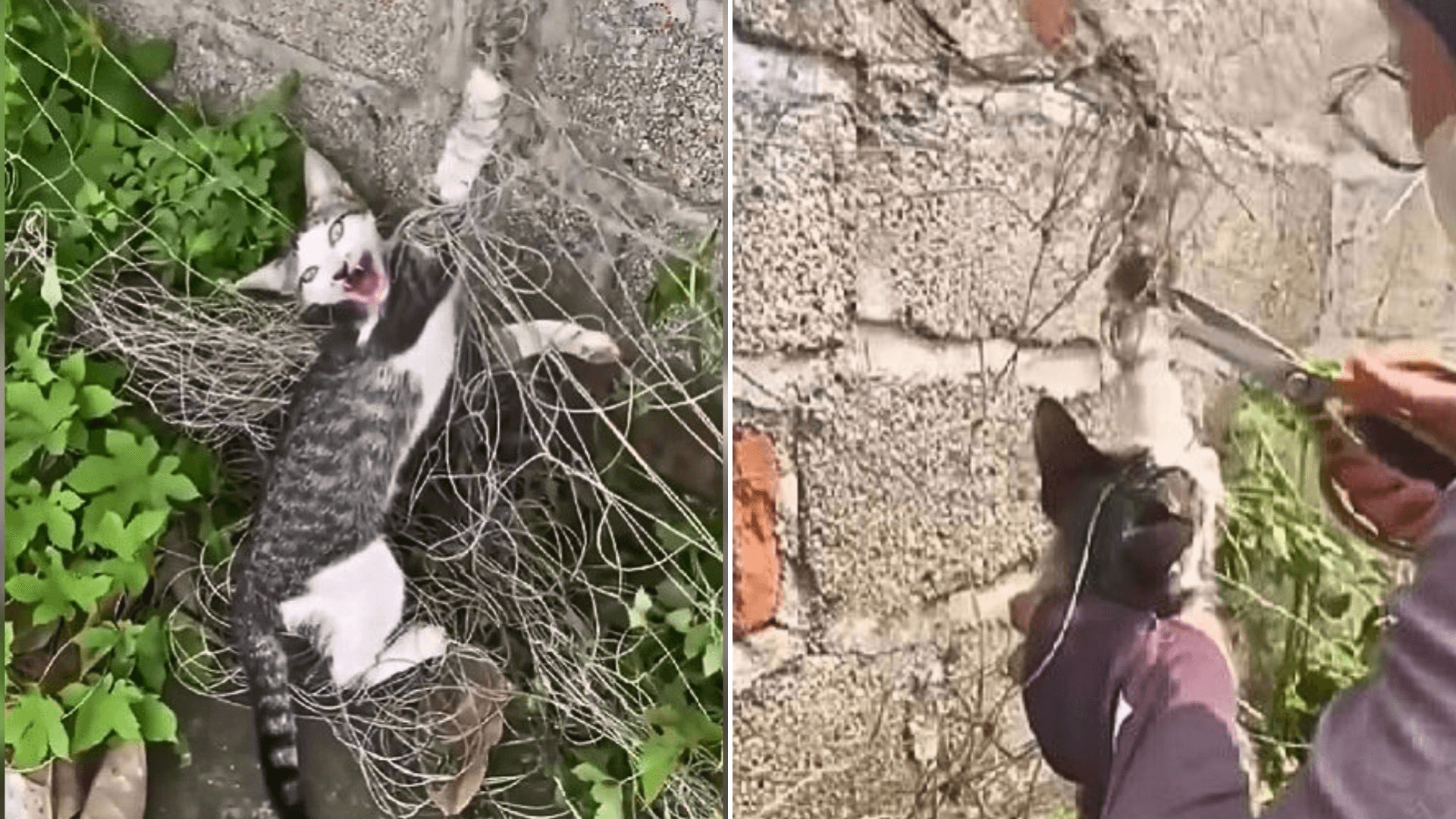 The poor feline was tangled in what looked like a piece of fishing or garden netting.