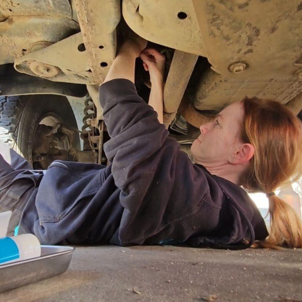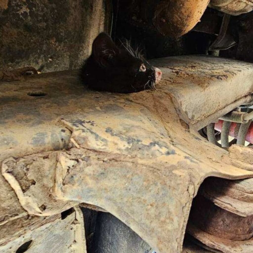 Tucked into the frame of his vehicle was a tiny black-and-white kitten, her head jammed tight into a narrow gap.