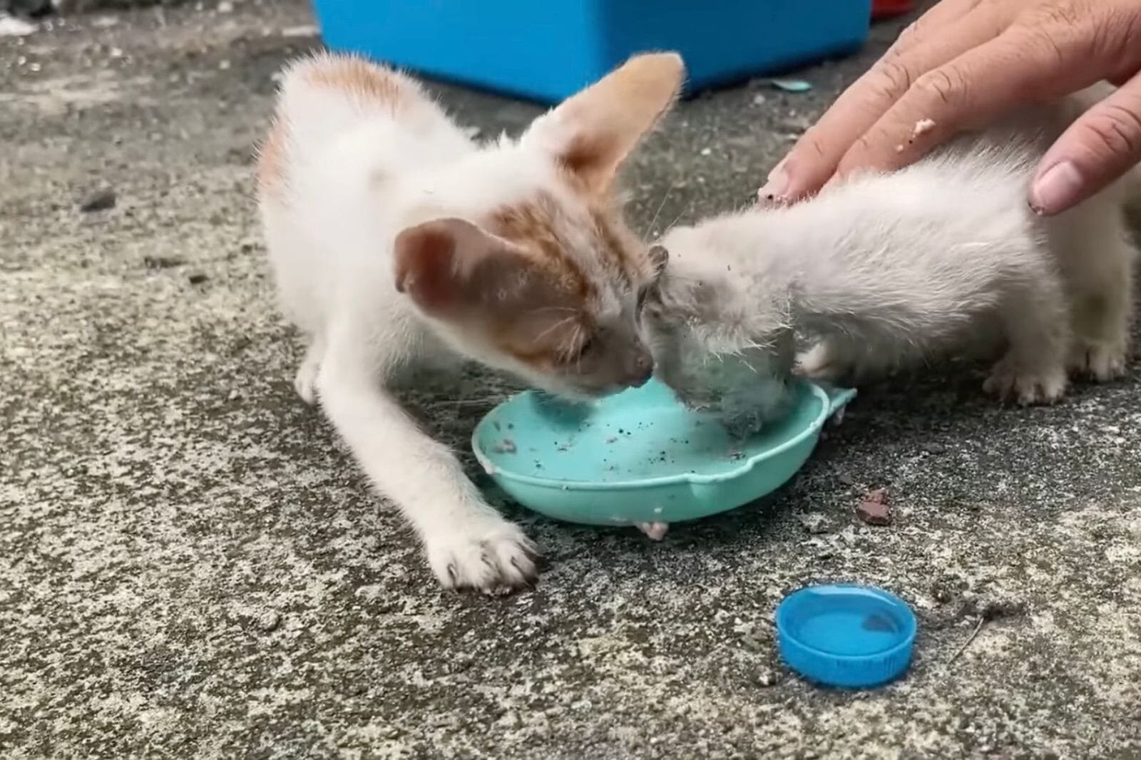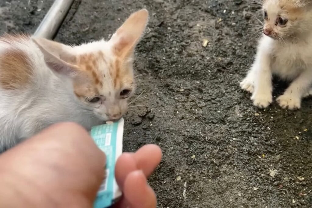 Eventually, the bigger kitten, still hungry and trembling, made the first move.