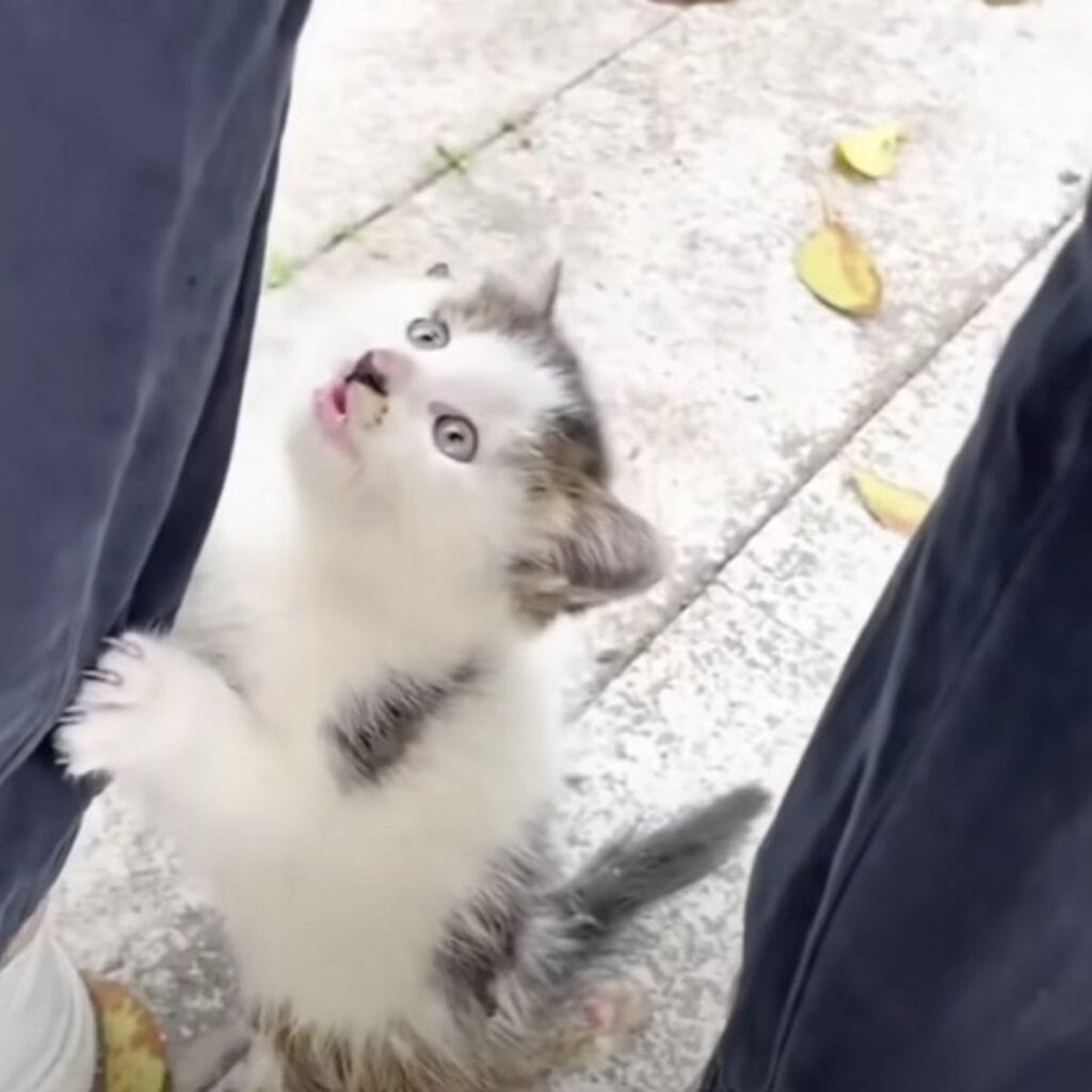 The man crouched down, and before he could even react, the kitten pressed himself against his leg.