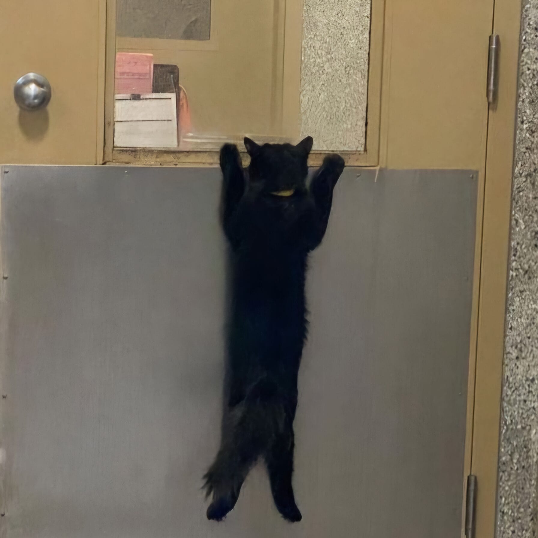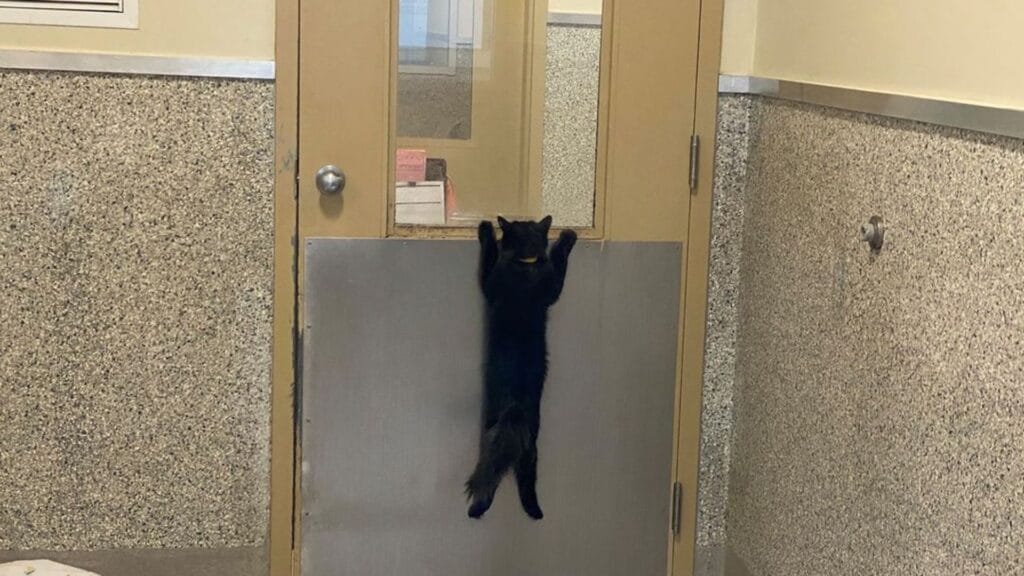 That’s exactly what happened when a small black cat, with big soulful eyes, was photographed clinging to the door of its animal shelter.