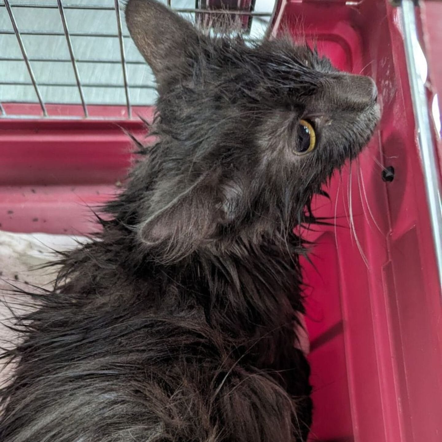 Her long grey fur was drenched and clinging to her tiny body, but luckily she wasn’t seriously injured. She was scared, but she was alive.